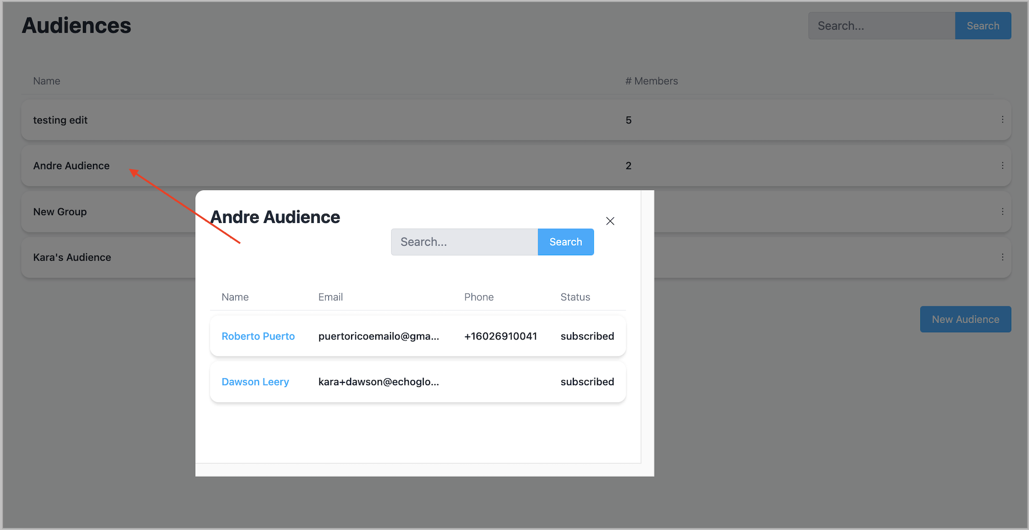 The Audiences menu is where you can view your existing audiences and add new ones. Audiences are only for use with SMS Autoresponders, to send a text message blast to a specific group of users that you've added to an audience.