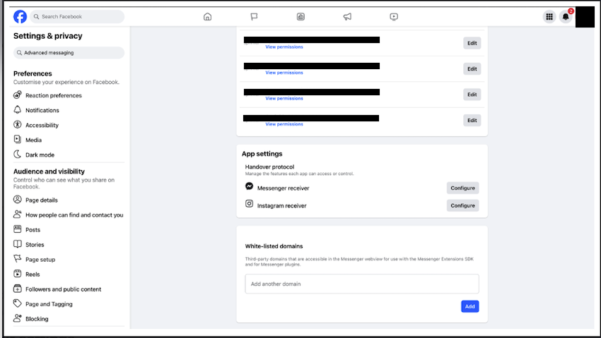 - Go to the Settings of your Facebook page on the native platform and select Page setup from the options in the left-hand menu. Once done, a window titled Page setup will open with various setup options. Look for Advanced messaging and click on View next to it.