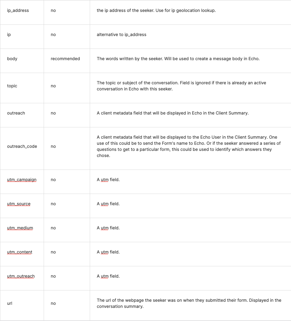 - We need to associate this form fill with an Echo "Web Contact Website". This is done with the website_uuid field.