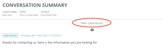 Filter - If your Echo Administrator has enabled filters and the message went through a filter, that filter name will display at the top of the message. Only the first message in a conversation will go through filters.