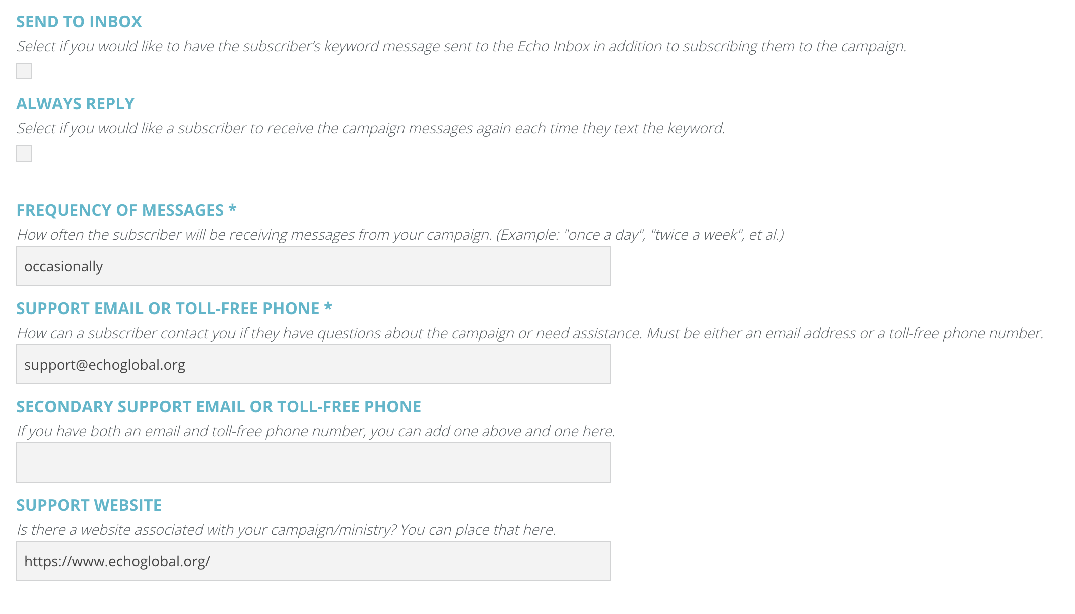 Send to Inbox: Select if you would like to have the subscriber’s keyword message sent to the Echo Inbox in addition to subscribing them to the campaign.